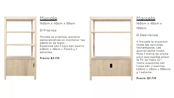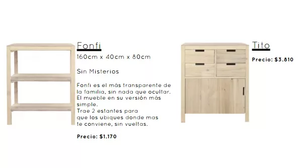 Encaja cuenta con dos líneas: la alta y la chica. La arquitecta nombró a cada mueble según sus referencias, por ejemplo: Francisco, el conciliador ($ 3.370); Alfonso, el creador ($ 2.237); Roberto, el organizado ($ 4.530); Manolo, el práctico ($ 3.170) y Marcelo -en honor a Marcelo Tinelli-, el electrónico ($ 3.710), ideal para apoyar televisores y demás aparatos.