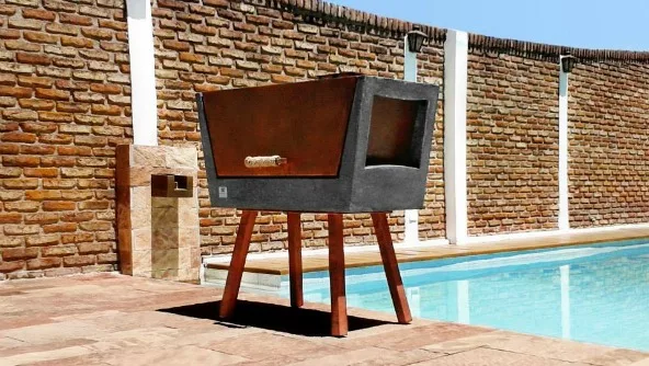 Batea es el nombre del parrilla tipo tambor ideal para asar con poca brasa. Cuenta con tapa de hierro, paredes de concreto y patas de madera con líneas rectas, limpias y modernas.