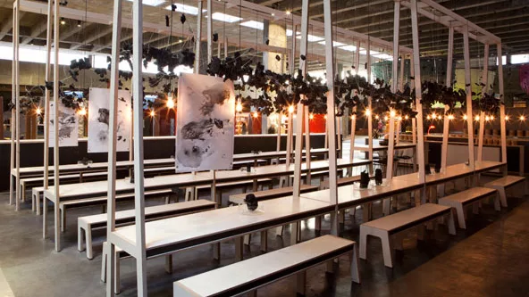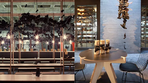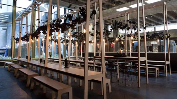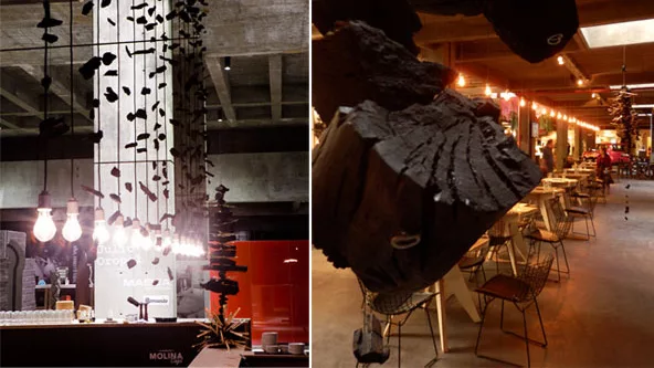 Concepto y diseño fueron los pilares del espacio. En clara alusión a la función original del inmueble -un espacio fabril-, y a la época de su apogeo como industria -tiempos en que el carbón era el combustible básico en los procesos de industrialización-, la cafetería de Oropel recrea los comedores con grandes mesones de las fábricas de principios del siglo 20, y utiliza el carbón como único elemento decorativo.