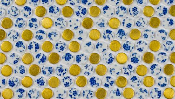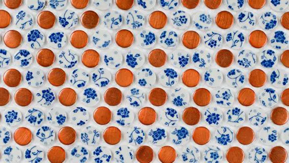 Se trata de planchas de 30,5 por 29,5 centímetros que cuentan pequeños círculos de la clásica porcelana Delft con otros de aluminio con colores vibrantes (verde, naranja, rosa, azul y amarillo).