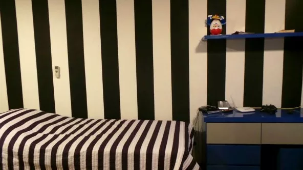 Para evitar colores planos en todas las superficies, la arquitecta jugó con las texturas y el pasaje del negro a blanco en tres planos: “una de las paredes es totalmente negra, la que está contigua presenta rayas blancas y negras para así culminar en una superficie totalmente blanca y variar los tonos”.