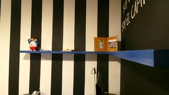 Lo cierto es que en el caso de la habitación con el que ejemplificamos, las paredes están cubiertas de negro y los muebles le brindan el toque de azul necesario para -en este caso- un niño de 10 años.