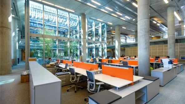“Lo que primero llama la atención del nuevo edificio es su cubierta ondulada de 10.000 m2 que se expande por la mayor parte del terreno”, sostienen desde Criba y agregan: “Su diseño enmarcado en grandes frentes vidriados genera ámbitos de trabajo donde la transparencia y la claridad son fundamentales”.