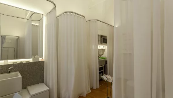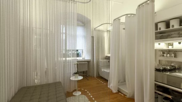 Lo cierto es que al momento de ingresar a la habitación el blanco que predomina en texturas y tonalidades hace que los 20 m2 parezcan más. Sin embargo, la solución que idearon para sectorizar los ambientes es lo que destaca el ingenio del Bureau: en el piso son líneas de puntos las que dividen los espacios de circulación de los cuartos, mientras que desde el techo caen cortinas que juegan una suerte de velo translúcido dejando entrever qué se esconde en cada lugar; “lo que se ve, lo que se intuye”, agregó Kraviez al tiempo que detalló: “así, organzas, vinilos, gasas, linos y voiles generan límites sutiles, impermeables, opacos o texturados dependiendo el uso de cada microespacio”.