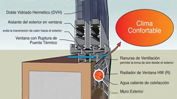 Se trata de un sistema de ventanas climatizadas de última generación que permiten calefaccionar la vivienda mediante un radiador que trabaja sobre el perfil de la ventana. Este diseño innovador, incorpora el radiador en su abertura, generando ahorro de consumo y un calor saludable.