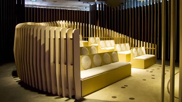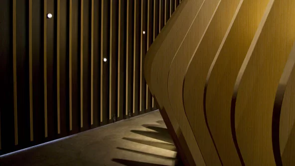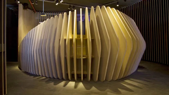 Masisa fabrica tableros de MDF, aglomerado, melaminas y molduras, y en el caso del “Auditorio” se hizo con un monomaterial: los tableros Masisa, que envuelven el espacio con delgadas placas que se repiten y van rotando suavemente logrando un ritmo armonioso. Placas más bajas y de alturas variadas rotan para entrelazar la estructura que sostiene los asientos, también realizados con tableros.