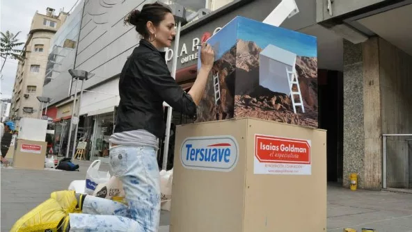 Luli Chalu, interviniendo la obra principal de Mercado de Arte Eggo.