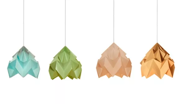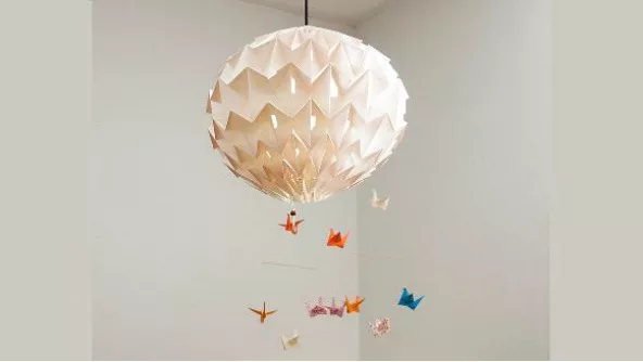 Las lámparas presentan las líneas típicas de las figuras que uno forma a partir de la técnica origami asemejándose a las clásicas grullas niponas que simbolizan la paz.