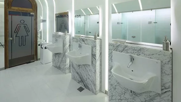 En contrapartida, el desarrollo de López + Castignani Arquitectos "Baños Públicos" en el Espacio #24 refuerza su estética en materiales nobles y oscuros que contrastan con "Blanco y blanco". "Las claves que caracterizan nuestro espacio son la introspección de cada uno de los cubículos, la simpleza de los materiales utilizados y el juego de luces, efectos y sombras que pretenden amalgamarse con la esencia del monasterio", explican los arquitectos.