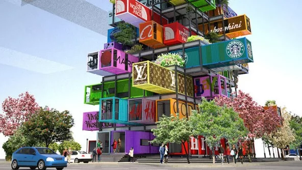 El diseño fue desarrollado para postularse por el Premio a la Innovación Radical y fue concebido desde la máxima velocidad y movilidad. ¿Cómo? Sí, el hotel está hecho a partir de contenedores de transporte que reciben un tratamiento de reciclado para que los locales comerciales que se instalen en su interior -entre ellos Nikon, Puma, Ferrari y Gucci por mencionar algunas de peso- puedan verse reflejados en el exterior. Cada bloque tendrá un color representativo de cada marca y conjugará a la perfección con el resto. Estarán apilados y algunos customizados en el interior para dar forma a cada una de las habitaciones.