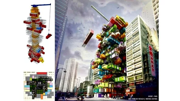 El OVA Studio, estudio de arquitectos con sede en Hong Kong diseñó el Hive Inn Hotel Jenga y le hace honor al clásico juego de piezas de madera salvo que el proyecto arquitectónico supone containers marítimos que sobresalen irregularmente desde el eje del edificio.