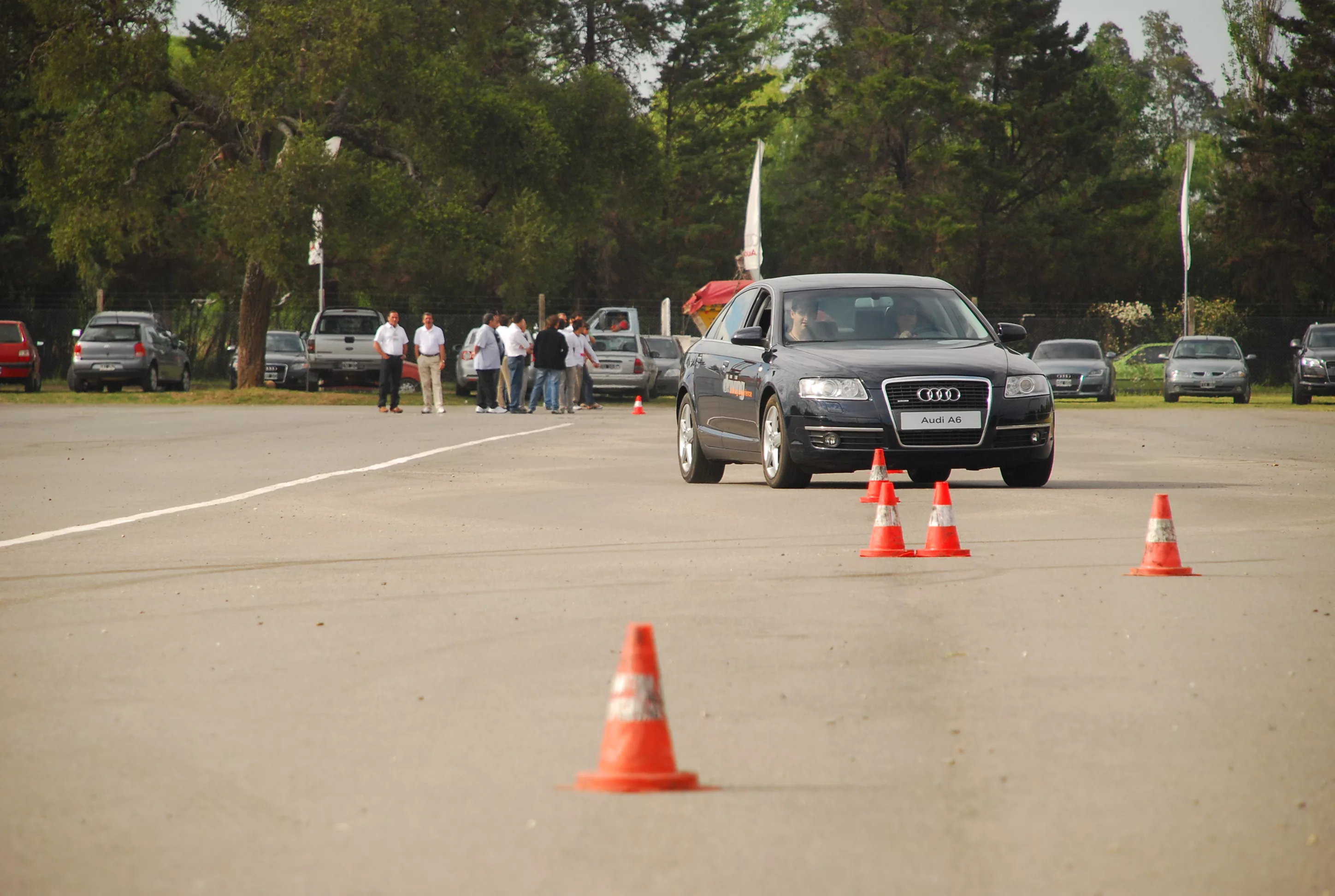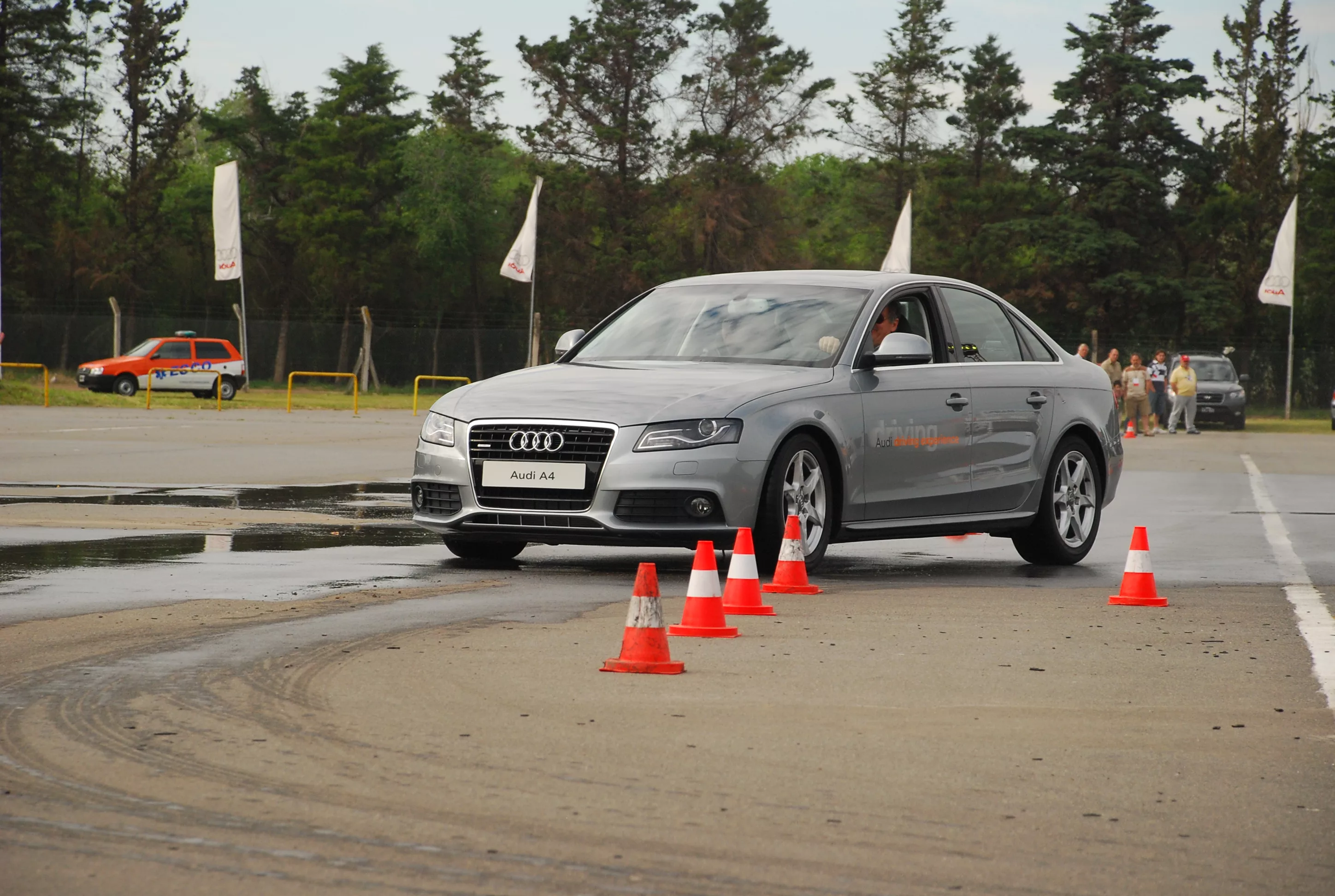 Las pruebas se dividían en dos partes: Slalom (zig-zags entre conos) con A4, A6 y A5, y frenado con piso mojado –y doblando al mismo tiempo- con Q7, A4 y TT.