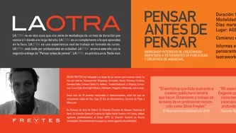Como parte de la segunda edición de Pensar Antes de Pensar, que arrancó el año pasado de la mano de Silvio Freytes, se viene ahora La Otra, una serie de workshops intensivos de creatividad, para complementar todo lo que aprendés en la facu. Con una duración de 8 clases (un mes) los martes y jueves a las 20, La Otra tendrá una modalidad de 20% teórico y 80% práctico. Las clases empiezan el 5 de abril y se dictarán en Agencis (Alvear 129).