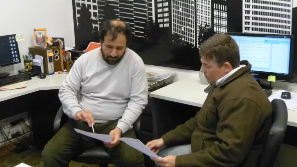 Gonzalo Piñero y miguel Toranzo (arquitecto encargado de la arquitectura corporativa ) trabajando en el espacio de trabajo donde habitualmente se ubican en la agencia.