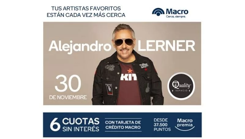 Con Macro, tus artistas favoritos están cada vez más cerca y -además de poder pagar las entradas en 6 cuotas sin interés- con InfoNegocios podés participar por un par de entradas al show. ¿La consigna? Decirnos en Comentarios (acá abajo) cuál es tu tema favorito de Lerner (seguido de tu nombre y apellido y últimos tres números de tu DNI)