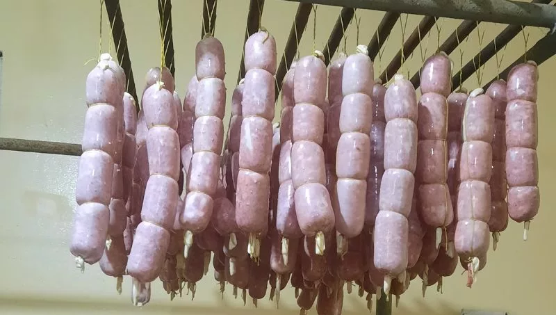 La particular elaboración se realizó respetando la receta del Sello de la Indicación Geográfica (IG), que este año cumple 10 años desde su aprobación en Nación, se hicieron 600 kilos de embutido, que con la merma por los 25 días de estacionamiento, quedarán cerca de 400 para cortar y servir en esa jornada.