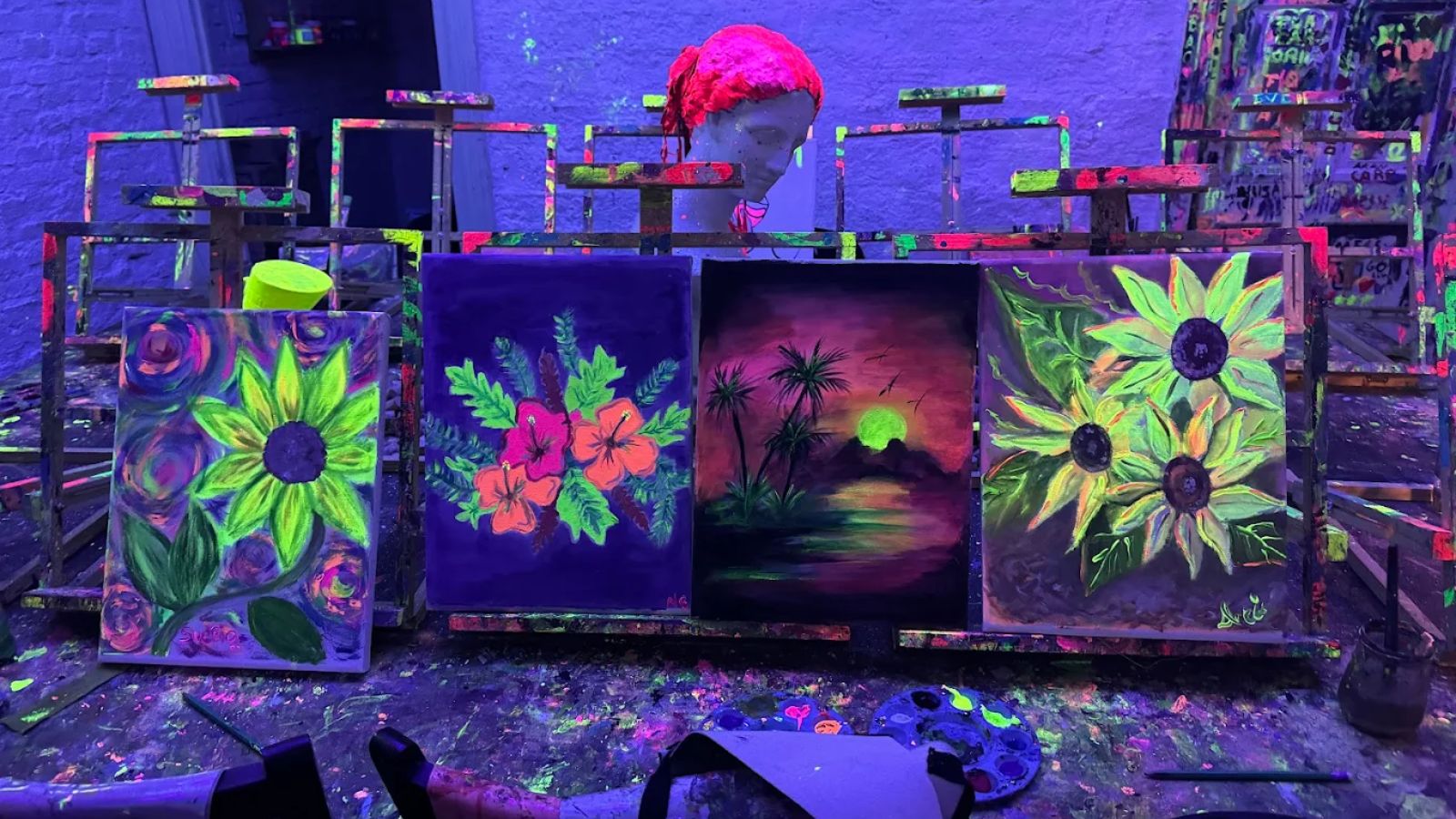 Comencemos desde el principio: ¿qué es Artpoint? Es un espacio donde cada persona, sin importar edad ni experiencia, puede crear su propia obra con pinturas neón bajo luz negra, en un entorno descontracturado, con música, buena vibra y acompañados de un buen vino y gaseosas ilimitadas durante las dos horas que dura el taller.